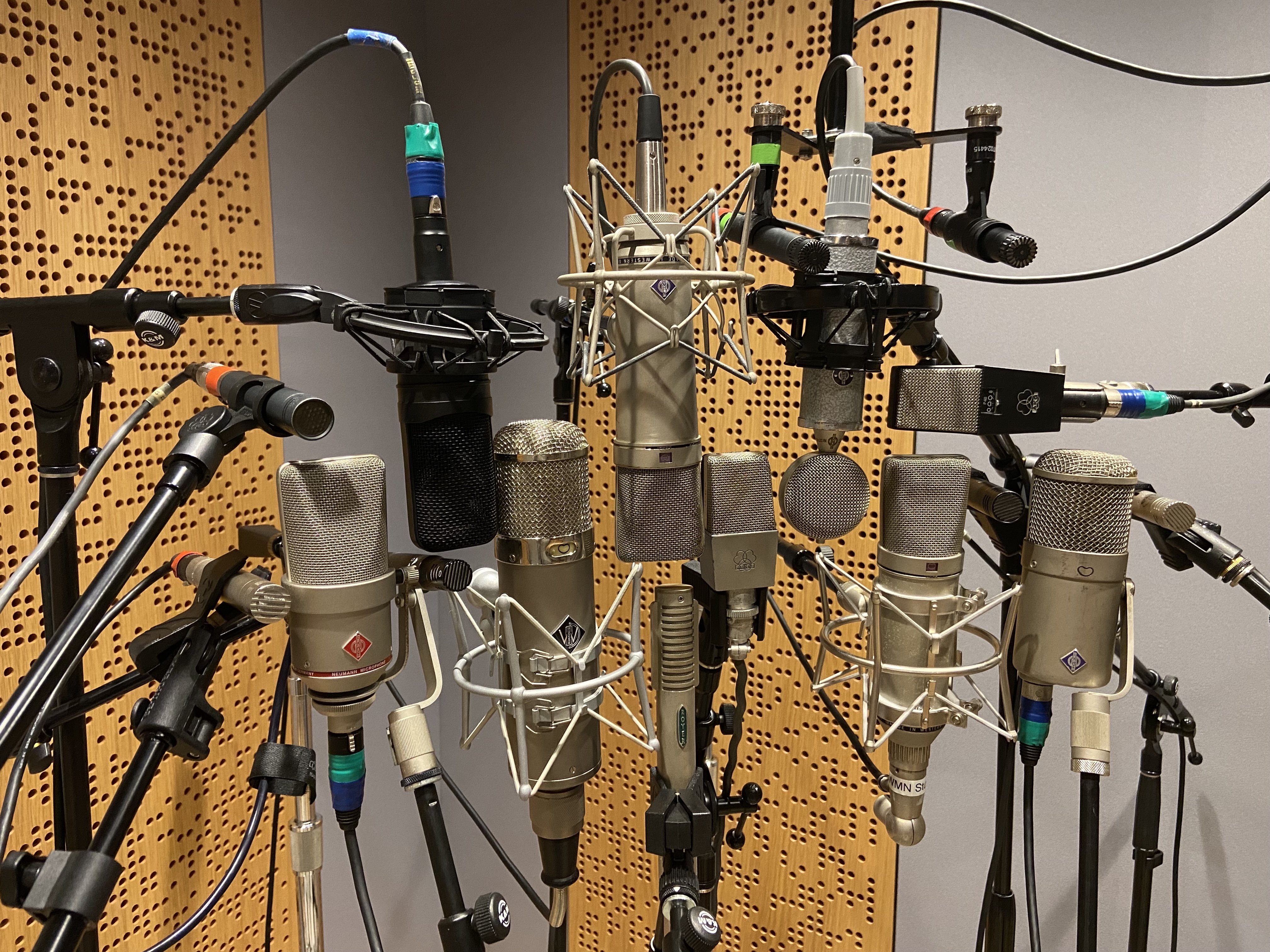 The microphone locker features a selection of large and small diaphragm condenser, dynamic and ribbon models, including a vintage Neumann U 67, a Fred Cameron-modified Neumann tube U 87, a Wunder Audio CM7 S (U 47 clone), a pair of Korby KAT4 convertible tube mics, and other gems.